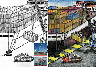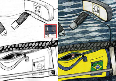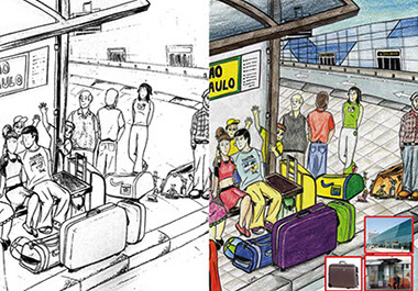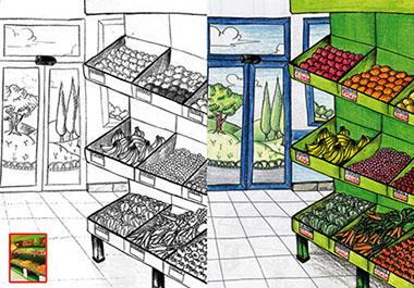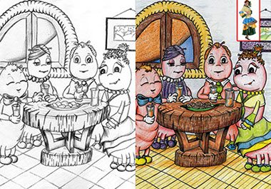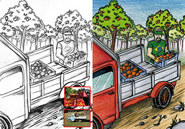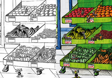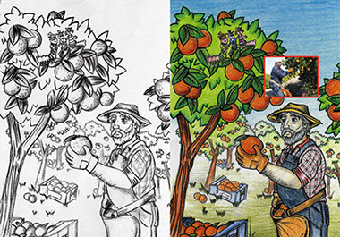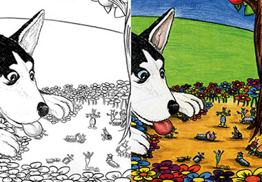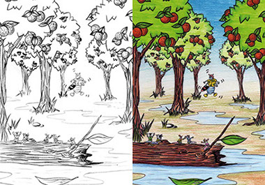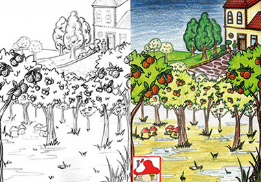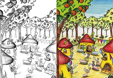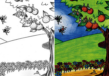 Pintado a mano con lápices de color y rotulado con rotulador punta fina.